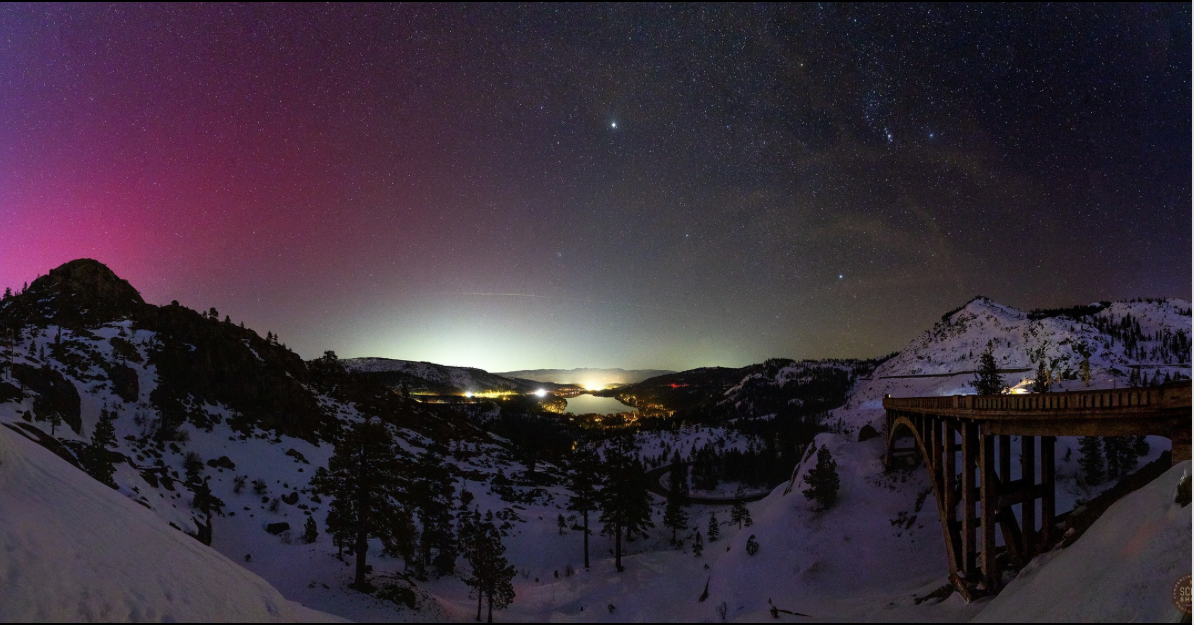 Aurora Borealis (dark red in sky at left) as seen from near Rainbow Bridge (January 19, 7:30 PM). Donner Lake is in the center. Photo is a panorama formed from 15 5-second f/2.8 images by Scott Thompson and posted on Facebook.